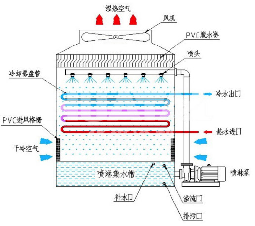 工作流體(純水或其它液體)在閉式冷卻塔的盤管中循環(huán),工作流體的熱量經(jīng)過盤管散入流過盤管的水中,同時機(jī)組外的空氣從盤管底部側(cè)面上的進(jìn)風(fēng)格柵進(jìn)入,與水的流動方向逆向,逆向流經(jīng)盤管,一小部分水蒸發(fā)而吸走熱量,熱濕空氣由冷卻塔頂部的排風(fēng)機(jī)排到大氣中;其余的水則落入底部水槽中,由水泵再循環(huán)至水分布系統(tǒng)又淋回到盤管上。